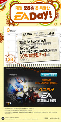 ... 3월 28일의 EA데이는 27일 대한민국 프로야구2010 개막을 기념해 ‘EA스포츠데이’로 지정하였으며 리얼 모바일 야구게임인 EA프로야구2010을 반값에 다운로드 받을 수 있는 이벤트를 진행한다. 이벤트는 28일 00시부터 24시까지 EA모바일 홈페이지 내 이벤트 페이지를