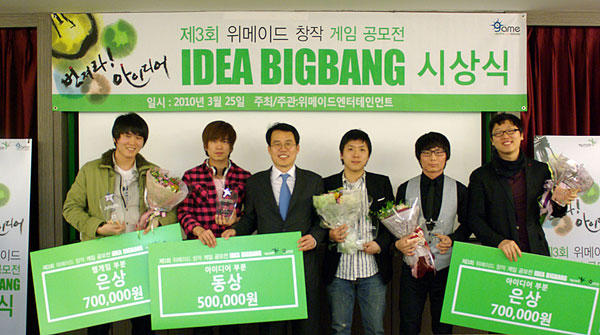 ... 이날 수상작 발표 결과 ▲아이디어 부문 얼어붙은강 건너기의 최대웅, Ply-Mix Box의 이창진 ▲웹게임 부문 도둑길드의 명대훈 ▲프로토타입 부문 Up & Down의 S. O. W Teamrhk 과 The Huntress의 Don Dori 팀이 수상했으며, 수상 팀에는