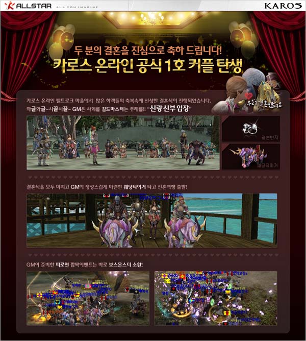 ... <카로스 온라인>에서는 이를 축복하고자 지난 3월 21일 펠트로크 마을에서 100여 명의 유저들이 지켜보는 가운데 특별히 제작한 ‘결혼반지’ 아이템과 ‘웨딩 타이거’를 증정하고 게임 속 성대한 결혼식을 진행 했으며, 피로연으로 함께 참석한 유저들과 함께 ‘보스몹’ 소