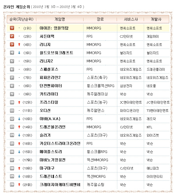 ... 이번 주 온라인게임 순위를 살펴보면 장르를 불문하고 소폭 상승한 게임들이 눈에 띕니다. 우선 장수 MMORPG '리니지'가 지난주에 비해 한계단 상승하며 3위를 차지했는데요. 올 초부터 '월드오브워크래프트'와 지속적으로 오르락내리락 순위경쟁을 펼치고 있는 양상입니다