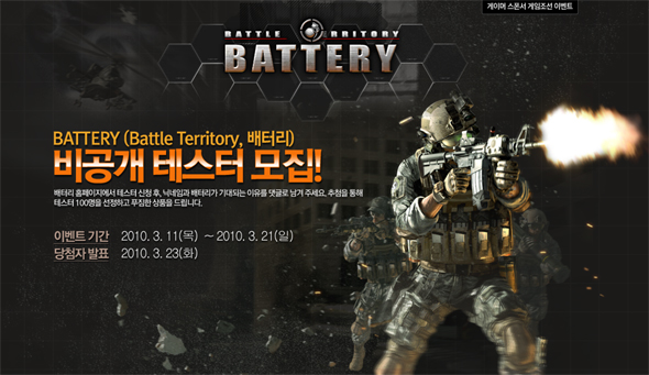 ... 게임조선을 사랑해 주시는 독자 여러분 안녕하세요. 지난 3월 11일부터21일까지 진행한 웹젠의 신작 FPS '배터리' 비공개 테스터 모집 이벤트에 참여해 주신 분들께 감사의 말씀을 드립니다. 베타테스트 자격은전체 응모 덧글 리스트에서 총 100분을 선정했고 추가로 100