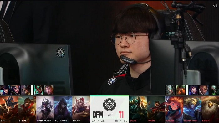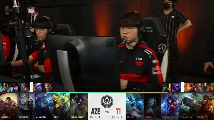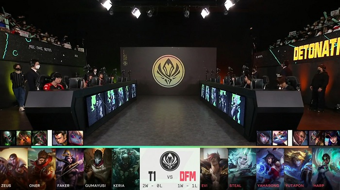 ... T1에서는 '제우스' 최우제, '오너' 문현준, '페이커' 이상혁, '구마유시' 이민형, '케리아' 류민석이 무대에 올랐다 경기는 밴픽부터 상당히 달랐다. 봇을 중심으로 한 밴이 이뤄졌으며, 이후팀 에