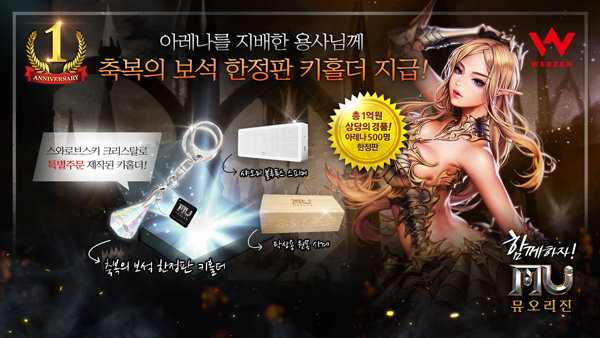 ... 이번 이벤트에서는 ‘랭킹’을 기준으로 1위부터 500위까지 안드로이드와 iOS 상위 회원 1천명의 회원들에게 ‘축복의 보석 한정판 키홀더‘과 탁상용 시계’, ‘블루투스 스피커’등으로 구성된 10만원 상당의 ‘뮤 오리진’ 한정 패키지가 지급된다. 특히 한정판 키홀더에 사용