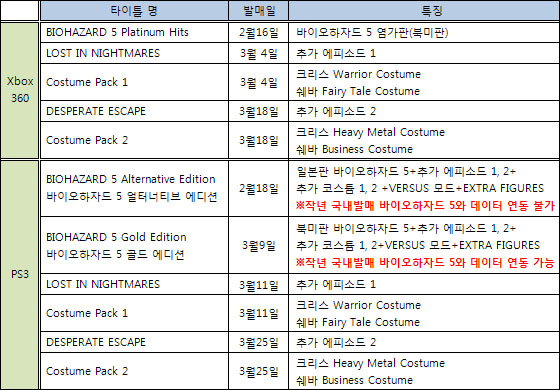 ...캡콤엔터테인먼트코리아㈜(대표이사 강진구)는 ‘바이오하자드 5’의 북미판 확장판인 ‘바이오하자드 5 골드 에디션’이 PS3로 오는 3월 9일(화)에 발매될 예정이라고 밝혔다. 이번 ‘바이오하자드 5 골드 에디션’은 PS3 북미판 버전으로, 2월 18일에 발매된 ‘바이오하자드 5