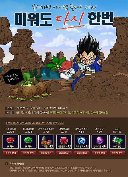 ... 이벤트 기간은 26일부터 오는 3월 21일까지로 15레벨 이상의 캐릭터를 보유한 고객 중 2월 이후 게임 접속 기록이 없는 분을 대상으로 진행되며, 해당 고객의 게임 접속시에 최고급 비클과 강화 아이템 등 아이템 풀세트를 지급한다. 또, 오는 14일까지 출석에 따라 다양한 캐쉬