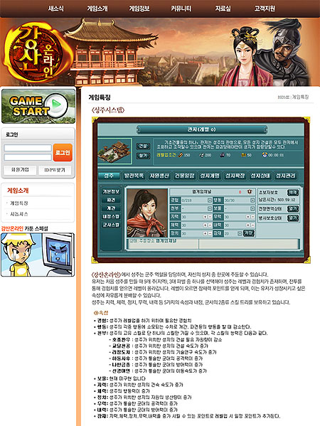 ... 새로 오픈되는 게임가이드 페이지는 <강산온라인>을 즐기는 유저들의 편의를 위해 마련됐다. 가이드 내에서는 게임 스토리를 비롯해 특징, 인터페이스, 영주 생성화면 및 시스템, 장군과 장비 시스템, 전투, 각 파벌의 병종, 내성 및 외성 건물 설명 등 게임 플레이에 필요