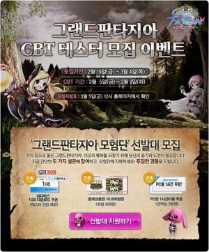 ...co. kr)는 자사가 서비스하는 판타지 온라인게임 ‘그랜드판타지아-정령이야기’(이하 그랜드판타지아)의 비공개테스트에 참여할 신청자를 2월 19일부터 3월 4일까지 모집한다. ‘그랜드판타지아’는 3월 5일부터 9일까지 5일간 비공개테스트를 진행할 예정이며, 이를 위해 총 1만 명