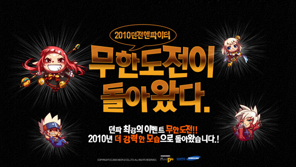 ...㈜네오플(대표 서민)이 개발하고, 삼성전자 주식회사(대표 최지성)가 서비스하는 온라인 액션게임 ‘던전앤파이터’(이하 던파)에서 2010년을 맞아 한층 풍성해진 ‘무한도전’ 이벤트를 실시한다. 오는 2월 18일부터 3월 4일까지 2주 동안 진행되는 이번 이벤트는 이벤트 기간 동안
