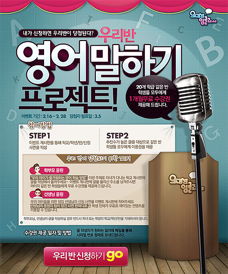 ... 이들 중 추천 수가 가장 높은 글을 선발하여 작성자와 같은 반 친구들 모두에게 오디션 잉글리시 1개월을 무료로 이용할 수 있는 수강권을 선물한다. 또한, 학생뿐만 아니라 담임 선생님도 참여할 수 있다. 담임선생님이 학생들을 대신해 신청사연을 작성할 경우 당첨확률은 높아진다 학