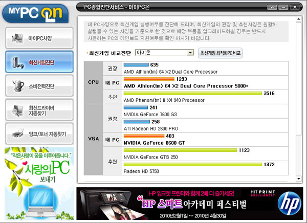 ...com)에서 최근 PC의 하드웨어 상태 점검 및 PC를 구동하기 위해 필요한 장치 드라이버를 자동으로 찾아서 업데이트해 주는 PC사양 종합 진단 서비스인 “마이PC온” 을 무료로 제공한다고 밝혔다. 지금까지는 대부분의 PC 사용자들이 자신의 PC 사양 상태를 정확히 알지 못해