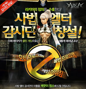 ... 유저가 직접 불량 이용자를 감시해 효과적으로 처리함으로써 쾌적하고 공정한 플레이 환경에서 모든 유저들이 즐겁게 게임을 즐길 수 있을 것으로 기대된다. 또한, ‘사법엘터 감시단’시스템은 에이카가 최초로 도입 및 실시하는 것으로 이를 통해 모든 MMORPG가 안고 있는 문제인 불량