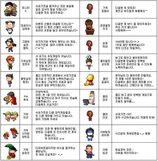 ... 특히, 게임에 대한 불만이 있는 이용자들의 스트레스 해소를 위해 일부 NPC는 공격이 가능하도록 해, 이용자들이 직접 개발자 NPC를 때리는 진풍경이 됐다. 이밖에 테스트 기간 중 ‘숨은 개발자 NPC를 찾아라’ 이벤트를 진행, 개발자 NPC의 인기를 배가시켰다. 개발자 NP