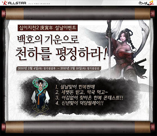 ... 먼저 설날 이벤트 기간 동안 구매 가능한 남. 녀 한복 아이템이 새롭게 선보이며, 게임에서 PVP(Player vs Player: 플레이어간 대전)나 ‘원일불사’ 몬스터를 사냥하게 되면 떡국과 세뱃돈이 드롭돼 활력단, 지각환 등 게임 아이템이 주어지는 이벤트가 진행된다.