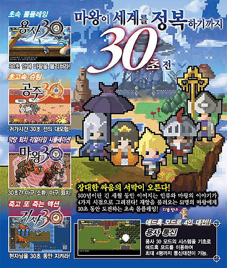 ...사이버프론트코리아(CFK, 대표 구창식)는 PSP® (PlayStation®Portable)용 초속 RPG 「용사 30」을 2010년 1월 29일, 오늘부터 PlayStation®Store를 통해 다운로드 판매를 개시한다고 밝혔다. 「용사 30」은 30초라는 한정된 시간 내에 세