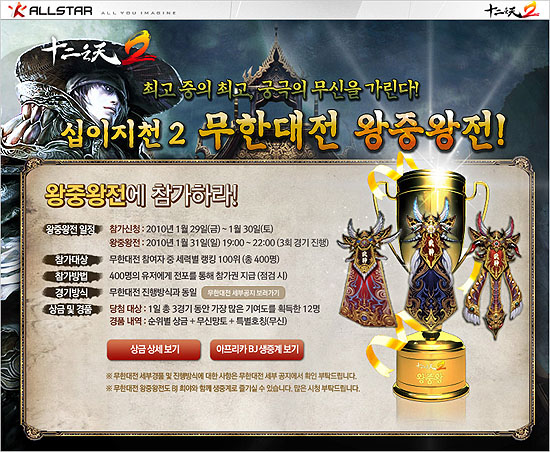 ...co. kr)는 자사가 서비스 중인 <십이지천2>에서 지난 6주간 진행해 왔던 무한대전의 최종 결승 ‘왕중왕전’을 이번 주말에 개최한다고 밝혔다. 이번 무한대전 ‘왕중왕전’ 대회는 지난 연말, 12경(157레벨)이상 유저들이 겨뤘던 대규모 비무전인 ‘무한대전’ 경기에