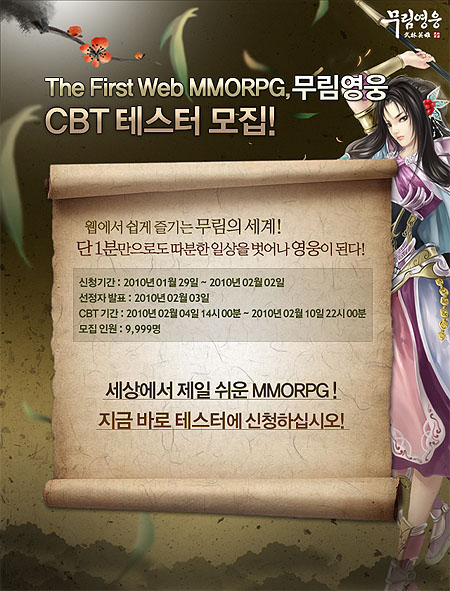 ...co. kr/>”의 첫 번째 비공개시범테스트(이하 CBT)를 내달 4일부터 10일까지 10일간 진행할 예정이며 29일 홈페이지 오픈과 함께 내달 2일까지 CBT 테스터를 모집을 실시한다고 밝혔다. 구글 차이나를 통해 ‘2009년 급상승 검색어 3위’를 차지하면서 화제가 되었