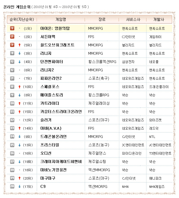 ... 이번주는 '월드오브워크래프트'의 순위 상승과 지난 주 '드래곤볼 온라인'의 약진에 눌렸던 캐주얼 게임 장르가 다시금 순위변동을 기록하며 기존 자리를 사수하려는 움직임을 보였습니다. 우선 지난주 5위에서 2개단 상승한 '월드오브워크래프트'는 최근 밸런스 조정 및 보스몬스터