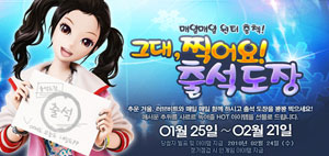 ... 홈페이지에 로그인한 후 이벤트 페이지에서 ‘출석하기’ 도장을 찍으면 이벤트가 완료되며, 하루 한 번 씩 최대 20개의 출석도장을 모을 수 있다. 20개의 출석도장을 모두 모은 고객에게는 ‘개근상’ 으로 게임 내에서 사용 가능한 인기 액세서리 아이템 4종 세트를 지급하며, 10개