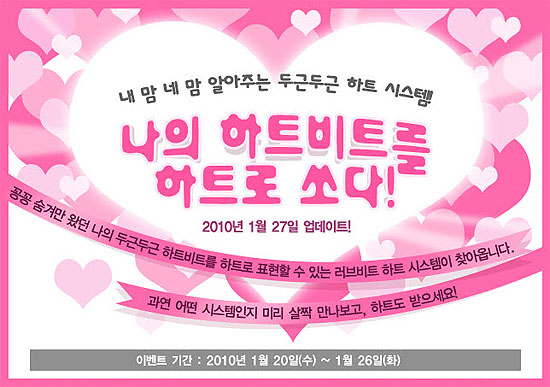 ... ‘하트’는 상점에서 구입해 사용할 수 있으며, 상대방에게 선물하는 하트의 개수에 따라 다양한 그래픽 효과가 연출된다. 특히, '좋아해/불쌍해/부끄러워' 등 메시지 내용에 따라 재미있는 애니메이션이 함께 구현되어 더욱 눈길을 끈다. ‘하트 시스템' 도입으로 러브비트 게임 내에서