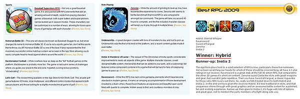 ...gamevil. com)은 자사의 애플 앱스토어용 게임 3종이 Touch Arcade, TouchGen 등 해외 유명 앱스토어 리뷰 사이트에서 2009년 장르별 베스트 게임으로 잇따라 선정되었다고 20일, 밝혔다. Touch Arcade는 미국 최대 규모의 앱스토어 리뷰 및 포럼