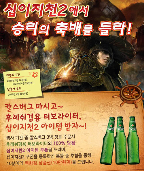 ...co. kr)는 자사가 서비스 중인 '십이지천2'에서 맥주 업체 ‘칼스버그’와 전략적 제휴를 맺고 이벤트를 개최한다고 밝혔다. ‘십이지천2’는 지난 연말부터 진행된 무한대전 최종 결승인 ‘왕중왕전’을 앞두고 맥주업체 ‘칼스버그’와 제휴, ‘승리의 축배를 들라!’라는 이벤트를 금일