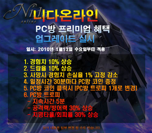 ...니다엔터테인먼트(대표 정대화)는 지난해 12월17일 시작된 '니다온라인'의 PC방 프리미엄 혜택 서비스 혜택을 상향 조절한다고 14일 전했다. 상향되는 혜택은 다음과 같다. ▲ 경험치 10% 상승 ▲드랍율 10% 상승 ▲일정시간30분마다 PC방 코인 증정 ▲PC방 코인 클릭
