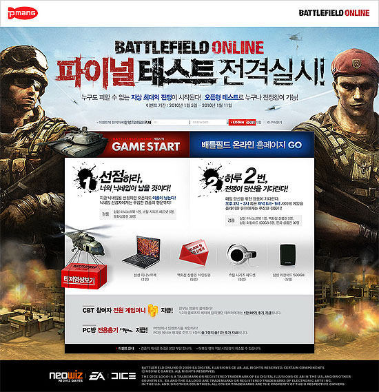 ... ‘배틀필드 온라인(Battlefield Online)’은 지난 2005년 발매돼 큰 히트를 친 '배틀필드 2'를 기반으로 개발 중인 FPS 게임으로, 국가 별 다양한 무기와 장비, 다양한 병과 등을 구현하고 있다. 특히 온라인 FPS게임 최초로 최대 100명이 참가하는 대규모