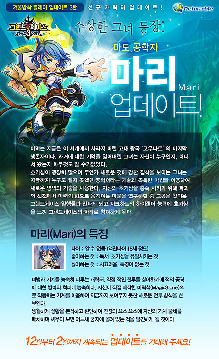...net, 대표이사 정영종)이 서비스하고 KOG(대표 이종원)가 개발한 액션대전게임 <그랜드체이스>가 겨울방학 맞이 릴레이 업데이트의 제 3탄으로 23일 신규 캐릭터 ‘마리’를 추가하고 관련 이벤트를 실시한다. <그랜드체이스>의 릴레이 업데이트는 지난 9일의