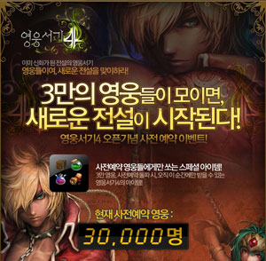 ...co. kr)는 액션 롤플레잉 게임 '영웅서기4'의 출시 사전행사로 진행중인 3만 영웅 사전 예약 이벤트의 참가자가 이벤트 시작 10일 만에 3만명을 돌파했다고 밝혔다. 지금까지 모바일 업계에서는 사전 예약 이벤트 성공의 기준을 1000명 수준으로 매겨왔다