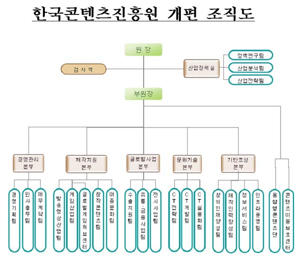 ... 한국콘텐츠진흥원은 글로벌 융합환경에 적합한 지원체계 마련을 위해 지난 7월 문화체육관광부가 발표한 ‘콘텐츠진흥 사업 지원체계 개선방안’을 효과적으로 수행하기 위해서는 대대적인 조직개편이 불가피 하다고 밝혔다. 종전의 조직구조는 지난 5월 통합 과정에서 조직의 안정성을 고려해