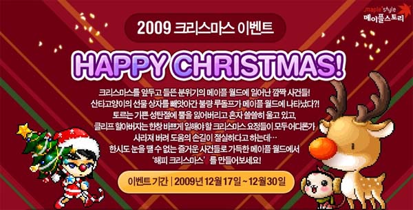... 이벤트 기간 동안 메이플 월드에서는 ‘토르의 잃어버린 뿔 찾아 주기’ 퀘스트를 비롯해, ‘산타 고양이의 선물상자’, ‘크리스마스 요청 찾기’, ‘2009 루돌프 훈장’, ‘크리스마스 트리 장식하기’ 퀘스트 등 크리스마스를 연상시키는 다양한 퀘스트들이 추가되고, 완수한 유저들에게는