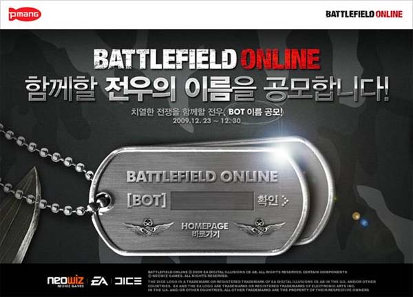 ... BOT란 배틀필드 온라인 게임 플레이 중 전투에 함께 참여하는 인공지능(AI) 캐릭터를 지칭하는 말로 전우와 같은 표현이다. 23일부터 30일까지 8일간 진행되는 이번 네이밍 콘테스트의 참여를 희망하는 게이머들은 이벤트 페이지에 캐릭터 이름을 등록하면 된다. 이용자들의 추