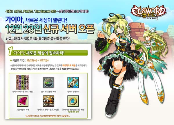 ... 넥슨은 ‘가이아’ 서버 오픈을 기념하기 위해 총 7가지 이벤트를 실시한다. 이벤트 상품으로 MP3 플레이어, 백팩, 외장하드, 전자사전, 넷북, 문화상품권 등의 현물 경품이 지급된다. 또한 각종 게임아이템을 비롯한 경험치, 게임머니, 드롭 확률 각각 2배, 근성도 무제한 등의