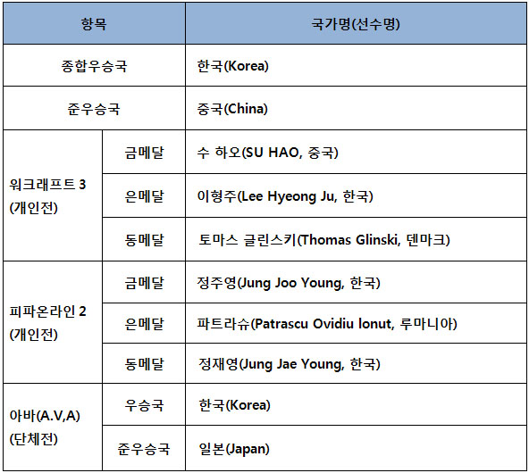 ... 기존 e스포츠 국제대회와는 달리 국가에서 인증한 전세계 20개국, 200여명의 선수와 임원이 참가하여 각국의 명예를 걸고 펼쳐진 ‘세계e스포츠대회’는 한국이 종합 우승을 차지하며, 원년 우승국의 영예를 누렸다. 개인전인 ‘워크래프트3’에는 중국 ‘수 하오(SU HAO)’선수,
