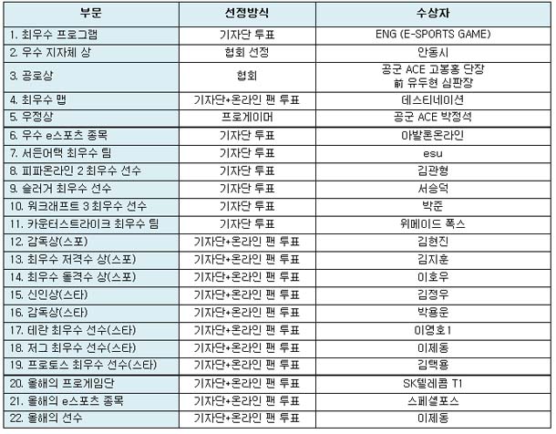 ... ‘e스포츠대상 올해의 프로게임단’은 신한은행 프로리그 08-09시즌 우승을 차지한 SK텔레콤 T1이, ‘e스포츠대상 올해의 종목’은 국산종목 최초 프로리그를 출범시키며 e스포츠 활성화에 공헌한 드래곤플라이의 ‘스페셜포스’가 각각 차지했다. 이번 대한민국 e스포츠대상은 협회 창
