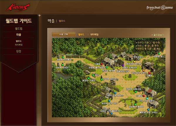 ... 마을과 다양한 던전의 모습들도 월드맵 가이드에서 편리하게 볼 수 있다. 엘우드 마을과 워터베일 마을의 전체모습이 담긴 맵을 이동, 확대, 축소 등을 통해 보면서 각 클래스의 교관과 중개상인, 대장장이 등의 위치를 파악할 수 있다. 이런 위치를 익혀놓으면 퀘스트 수행, 스킬