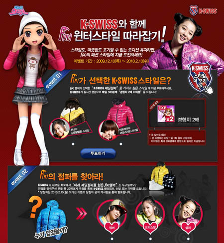... 또 '오디션' 이벤트 페이지에 등장하는 패딩점퍼를 케이스위스 화보에서 입은 ‘f(x)’의 멤버가 누구인지 맞추는 퀴즈에 응모하면 추첨을 통해 케이스위스의 패딩점퍼, 신발, 가방 등 푸짐한 선물을 증정한다. 케이스위스는 미국에 본사를 둔 스포츠 브랜드로 아메리카, 유럽, 아시아
