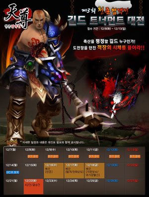 ...co. kr)는 자사의 무협 MMORPG ‘검혼일체, 천존협객전’의 제 3회 길드토너먼트 대전을 오는 12월 16일부터 22일까지 게임 내의 각 서버에서 진행한다. ‘천존협객전’의 이번 길드 대전에 참여를 희망하는 길드는 오는 12월 13일까지 홈페이지(http://tz