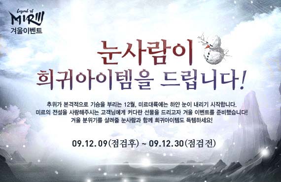 ... ‘적월곡’ 이상의 모든 던전에서 즐길 수 있는 ‘눈사람을 잡아라’는 초보 이용자들도 손쉽게 참여 가능한 게임 이벤트로, 게임도중 만나는 눈사람 몬스터를 물리치면 아이템과 교환 가능한 재료를 받는 시스템이다. 눈사람 몬스터를 물리친 이용자는 눈뭉치, 목도리, 산타모자 등 다양한