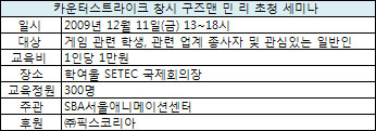 ...픽스코리아(대표 최인호)는 '카운터스트라이크(이하 카스)' 창시자이자 자사 부사장이기도 한 구즈맨 민 리(Gooseman 'Minh Le')‘ 가 SBA 서울애니메이션센터(서울산업통상진흥원, 대표 심일보)주관으로 오는11일 SBA SETEC 국제회의장에서 열리는 유료세미나에 연사로