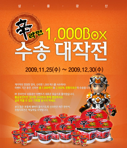 ... 이 이벤트는 게임 플레이를 통해 얻은 황금포인트로 신라면도 구매하고 무한 광렙까지도 즐길 수 있는 기회가 주어진다. 황금 포인트는 ‘RF온라인’ 게임 내에서 펼쳐지는 종족 전쟁에서 승리하거나 신생 캐릭터를 만들면 얻을 수 있는 황금박스를 통해서 얻을 수 있다. 또한 25일부