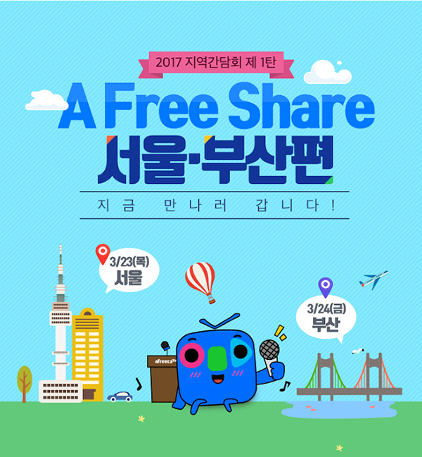 ... 23일은 서울 대치동 프릭업 스튜디오, 24일에는 부산 광안리 호메르스 호텔에서 진행된다. 이번 아프리카TV 지역간담회는 현재 활동 중인 BJ와 매니저, 예비 BJ를 합쳐 250명 이상이 참석한다. BJ들은 자신의 방송 경험과 노하우를 공유하고, 평소 아프리카TV에 궁금했던 점
