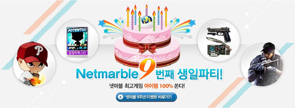 ...net)은 론칭 9주년이 되는 11월 20일을 맞이해 ‘넷마블 9번째 생일파티’ 이벤트를 진행한다. 11월 19일부터 12월 3일까지 진행되는 이번 이벤트는 지금까지 넷마블을 아껴준 회원들에게 감사의 뜻을 전하기 위해 참여자 전원에게 넷마블의 게임 아이템들을 선물한다. 먼저,