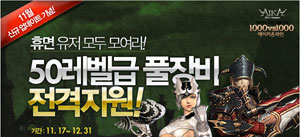 ...com)’이 휴면 유저를 대상으로 ‘휴면 유저 모두 모여라! 50레벨 급 풀장비 전격지원’ 이벤트를 실시한다고 오늘(19일) 밝혔다. ‘휴면 유저 모두 모여라! 50레벨 급 풀장비 전격지원’이벤트는 오는 12월 31일까지 실시한다. 10월 15일 이전 가입자 중, 11월 11일