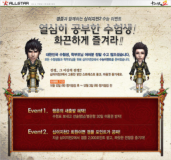 ...co. kr)는 알트원(대표 홍창우)이 개발한 MMORPG <십이지천2>에서 수험생을 위한 ‘수능 이벤트’를 진행한다고 금일(13일)밝혔다. ‘열심히 공부한 수험생! 화끈하게 즐겨라!’를 메인 슬로건으로 내세운 이번 ‘수능 이벤트’는 시험 당일인 이달 12일부터 12월