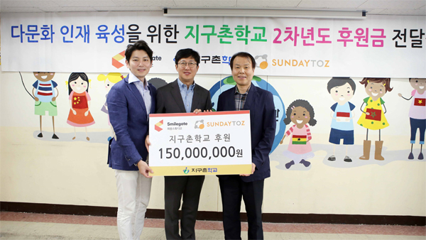 ... 이를 통해 다문화가정 어린이들은 안정적인 교육 환경을 제공 받을 수 있게 됐다. 스마일게이트 희망스튜디오와 선데이토즈는 지난해부터 다문화 인재 육성을 위해 양사가 협력해 총 3억 1,000만 원을 교육운영비로 전달했으며, 지난 2월에는 양사 임직원들이 지구촌학교를 방문하여 벽화