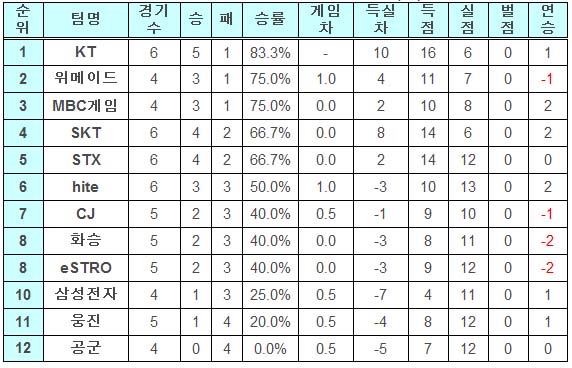 ... 지난 주차까지 4전 전승으로 선두를 달리던 KT는 지난 25일(일) CJ에게 불의의 일격을 당했다. 이영호만 승리하고 나머지 선수들은 모두 패하면서 시즌 성적 5승 1패로 단독 선두를 유지했다. 반면 지난 시즌 우승팀 SKT는 초반 부진을 씻고 25일(토) 화승과 28일(