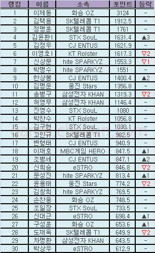 ... 이번 달은 개인리그 예선 외에 진행된 경기가 없어 전체적으로 선수들의 순위변동이 적었다. 한편 김윤환(STX, 저그)은 스타리그 예선을 통과하며 36강 진출에 성공, 3단계 상승하며 4위로 올라섰다. 11월 랭킹에는10일에 ‘신한은행 프로리그 09-10시즌’이 개막 하게