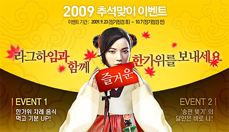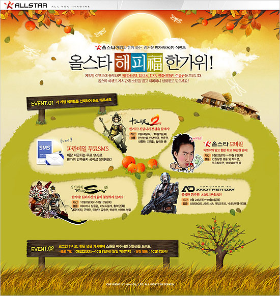 ...co. kr)에서 민족 최대의 명절, 한가위를 맞아자사가 서비스 중인 게임들에서 다양한 이벤트를 개최한다. 먼저 9월 22일부터 10월 8일까지 ‘올스타’ 전체 회원들을 대상으로 ‘올스타 한가위 이벤트’ 게시판을 통해 자신의 소원을 올리면 추첨을 통해 총 100명에게 해피머니