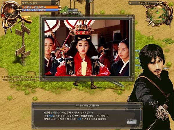 ... 게임 내 마을에 들어가면 영화 속 주인공인 호위무사 무명(조승우) 캐릭터의 <불꽃처럼 나비처럼> NPC를 볼 수 있다. 이 NPC에게 말을 걸면 영화에 대한 간단한 설명을 들은 후 예매 응모권을 구입할 수 있고, 이를 개인 인벤토리에 넣으면 이벤트에 자동으로 응모가